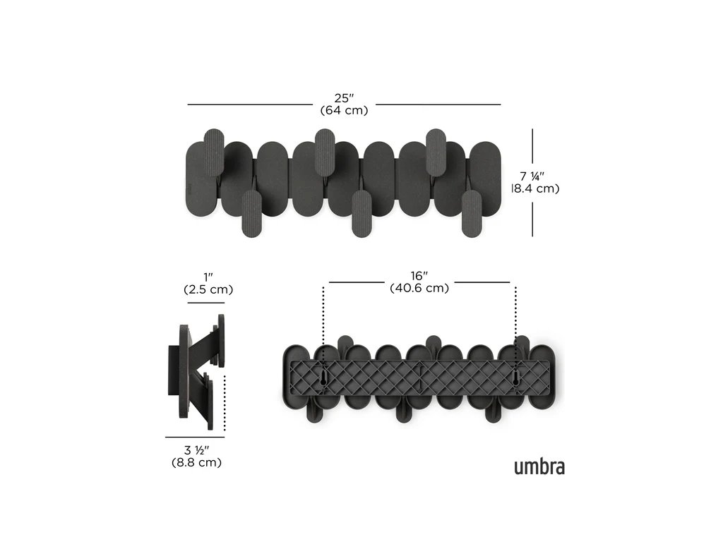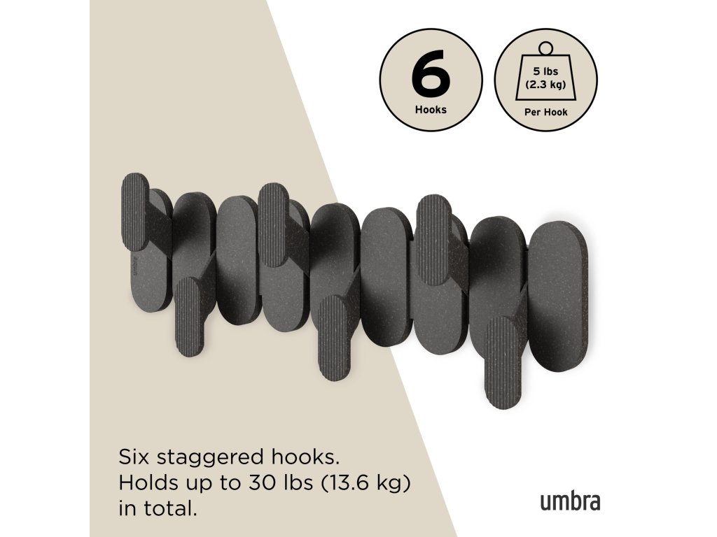 Nástěnný věšák Umbra TEMPO 6 v elegantní černé barvě je moderním a praktickým doplňkem do každého interiéru. Nabízí šest odolných háčků, které spolehlivě unesou kabáty, bundy, tašky i doplňky. Díky minimalistickému designu a kvalitnímu kovovému provedení se skvěle hodí do vstupních hal, kanceláří, šaten i ložnic.