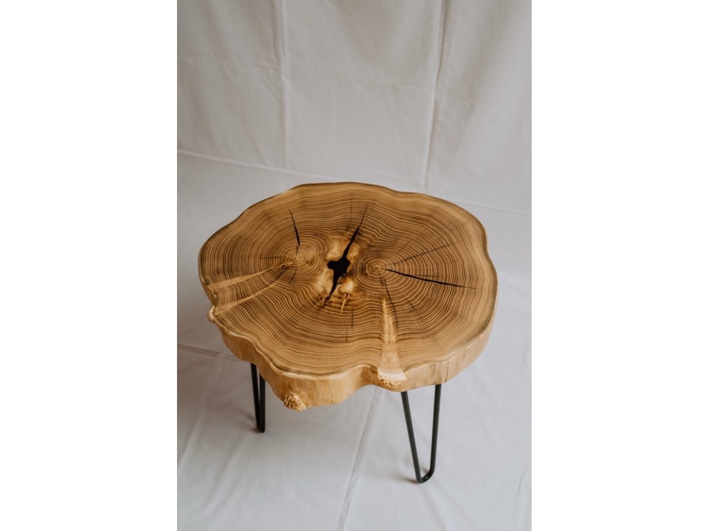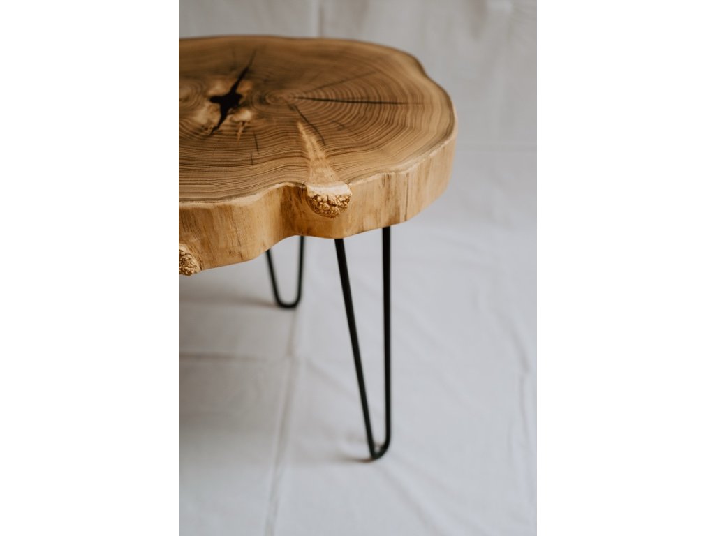 Stolek ROUND KLASIK p. 45 cm je ručně vyrobený z masivního dřeva. Stolová deska je precizně řezaná z kmene stromu, zachovává jedinečný přírodní tvar a strukturu. Praskliny jsou elegantně zalité epoxidovou pryskyřicí, což dodává stolku moderní a zároveň autentický vzhled. Stolek stojí na třech stylových kovových Hairpin nohou, které zajišťují stabilitu a doplňují minimalistický design. Povrch dřeva je pečlivě vybroušen a ošetřen kvalitním tvrdovoskovým olejem, který má certifikaci pro styk s potravinami – stolek je tedy nejen krásný, ale i bezpečný pro použití v domácnosti. Každý stolek je originál, s unikátní kresbou dřeva a barvou. Ideální jako odkládací stolek vedle pohovky, jako noční stolek nebo stylový doplněk vašeho interiéru.