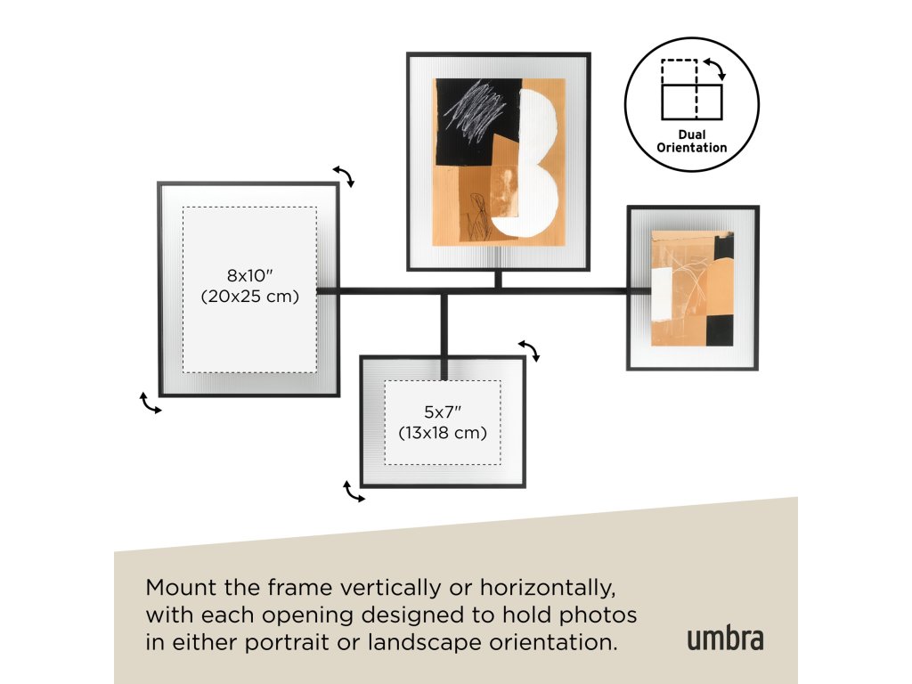 Rám upevněte vertikálně nebo horizontálně, přičemž každý otvor je navržen tak, aby fotografie držel buď na výšku, nebo na šířku.