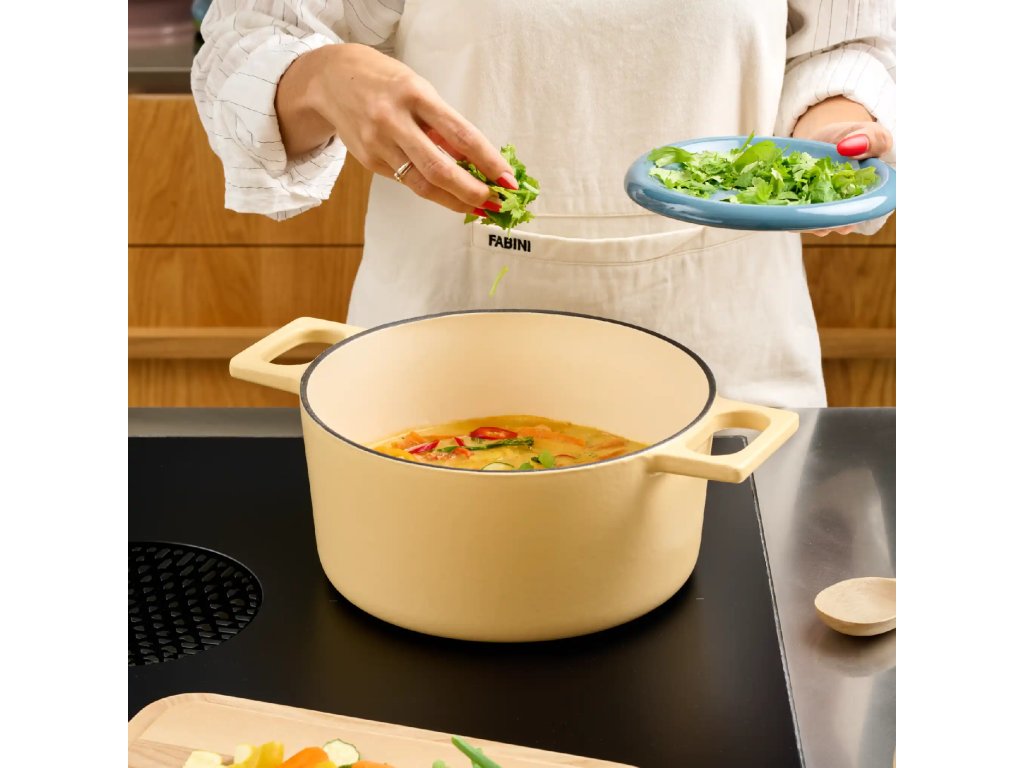 Litinový kastrol Fabini MATTIA 3.0 o průměru 26 cm a objemu 5,5 l je ideální pro pomalé vaření, dušení i pečení. Masivní litina skvěle akumuluje teplo a zajišťuje rovnoměrné prohřívání pokrmů, zatímco stylové žluté provedení dodá kuchyni osobitý vzhled. Kastrol je vhodný pro všechny typy sporáků včetně indukce i použití v troubě a je perfektní volbou pro ty, kteří hledají kvalitní a odolné litinové nádobí značky Fabini.