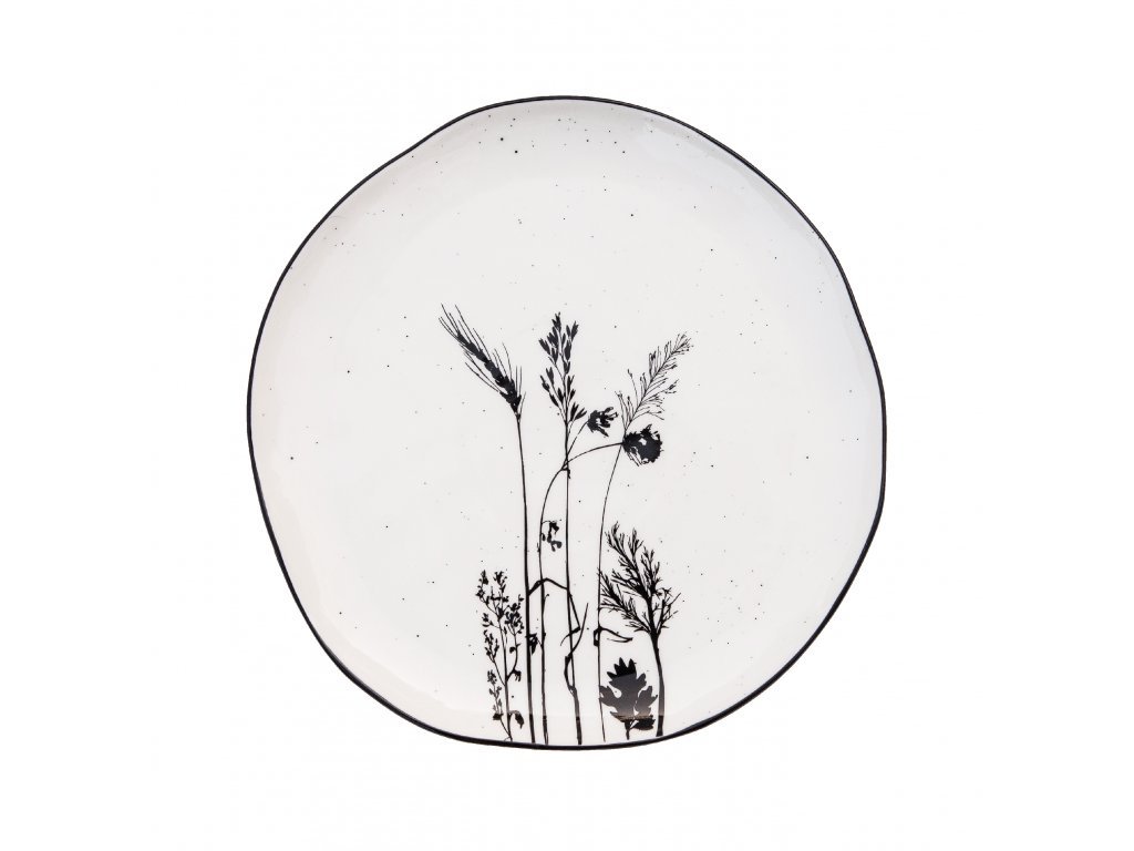 Dezertní talíř FIELD od značky by inspire. Talíř má nepravidelný tvar a kropenatý povrch s černým okrajem a motivem polní trávy.