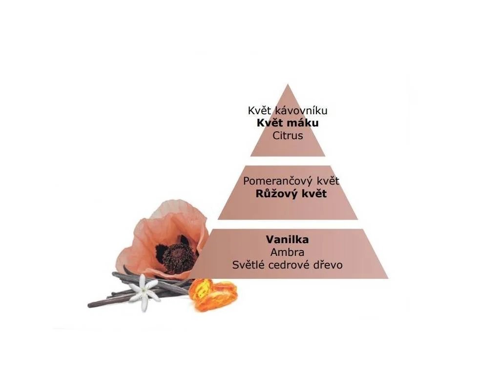 Samet z Orientu - květinová vůně - vrchol: květiny kávovníku, květiny máku, citrusy, srdce: květiny pomerančovníku, růžový pepř, základ: vanilka, ambra, světlý cedr.