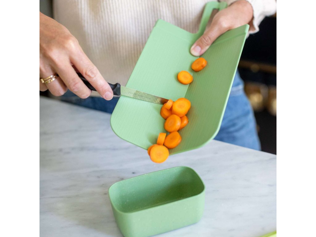Krájecí prkénko SNAP S - ORGANIC sklápěcí, zelené od německé značky Koziol. Sklápěcí prkénko usnadní vysypání nakrájených potravin.