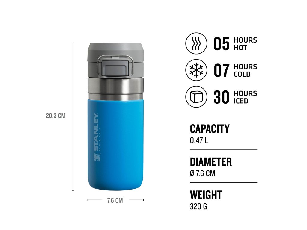 QUICK FLIP vakuová termoláhev 470 ml, azure modrá od značky STANLEY je ideální na sport, výlety, do auta. Láhev má kovové poutko pro nošení nebo zavěšení.