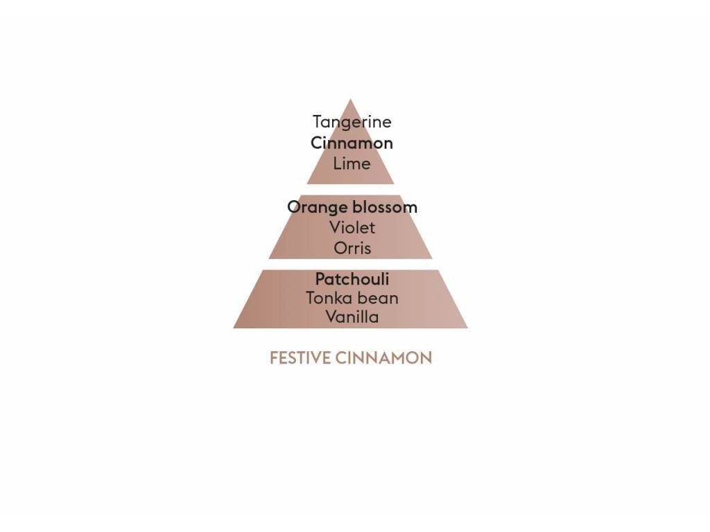 Skořicové Vánoce - je smyslná vůně, která vytvoří kouzelnou atmosféru Vánoc. Vrchol: mandarinka, skořice, zelený citron, Srdce: květy pomerančovníku, fialky, kosatec, Základ: pačuli, tonkové boby, vanilka.