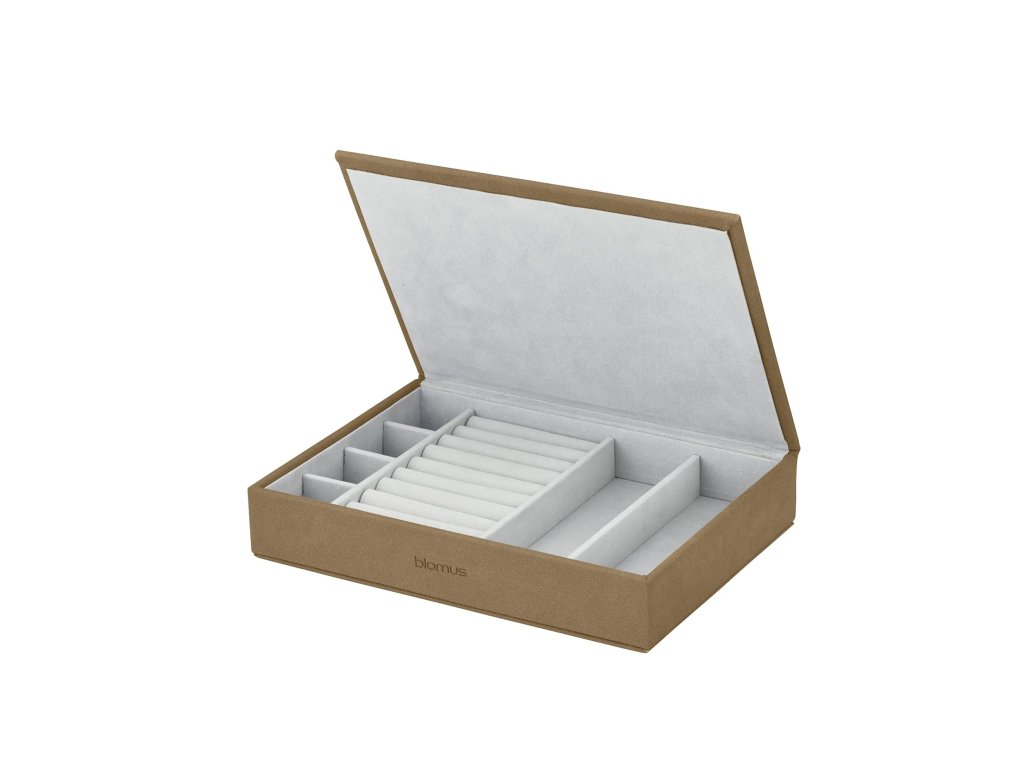 Šperkovnice SAHLA M v hnědé barvě je elegantním řešením pro přehledné uložení šperků. Kombinuje nadčasový design značky Blomus, kvalitní materiály a jemné zpracování inspirované moderním minimalismem. Vnitřní členění umožňuje bezpečné uložení prstenů, náušnic i náhrdelníků, zatímco kompaktní rozměr velikosti M je ideální na komodu i do šatníku. Hnědé provedení dodává šperkovnici luxusní a hřejivý vzhled, který stylově doplní každý interiér.